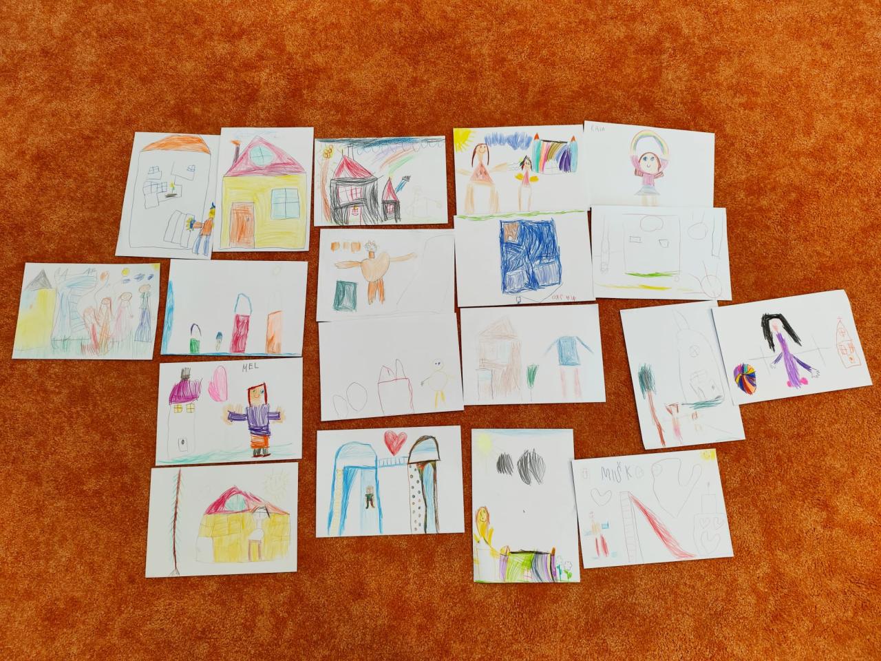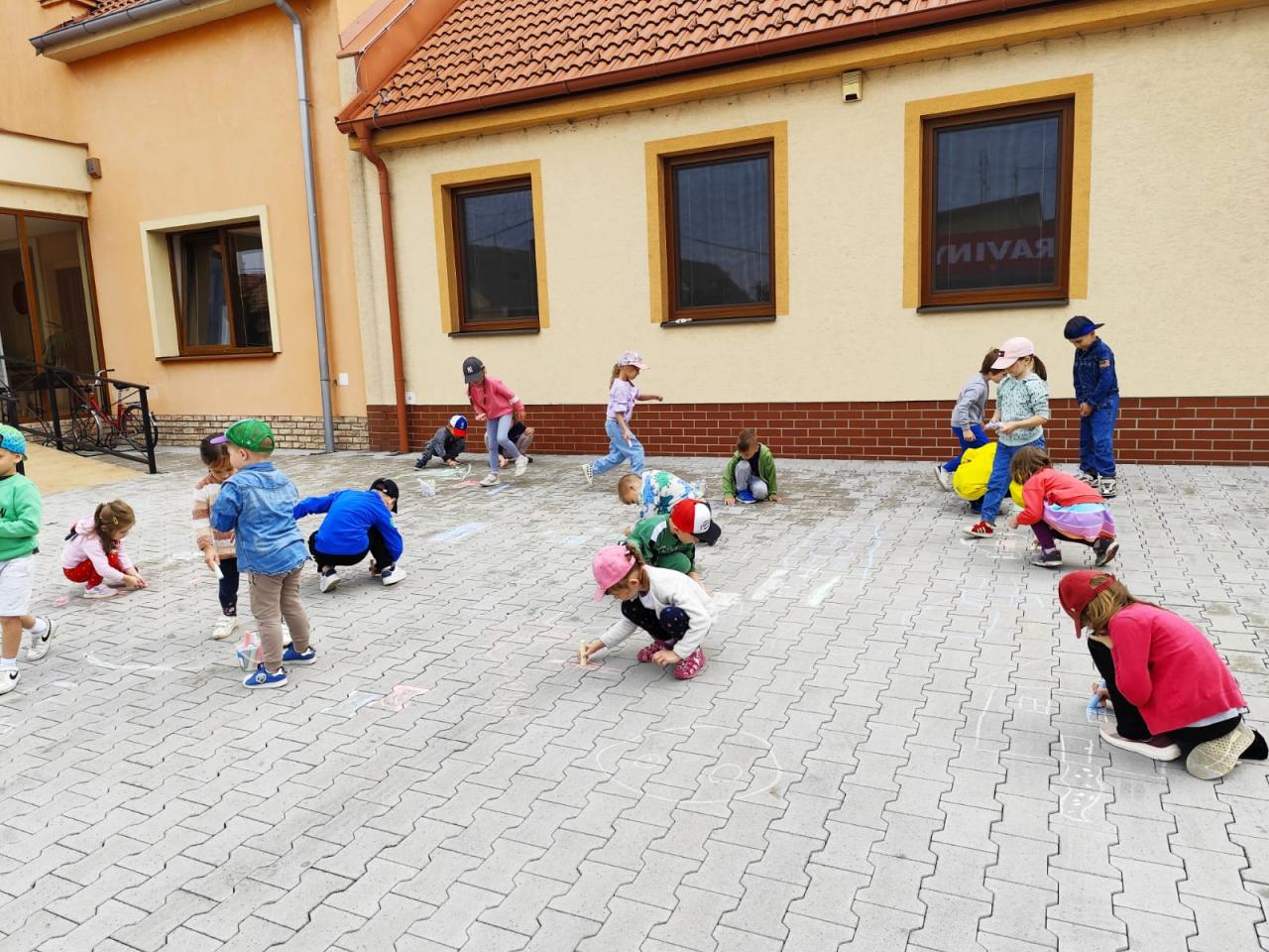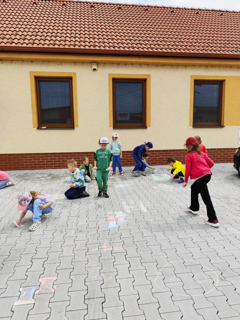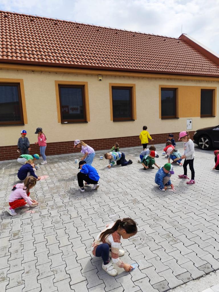 Kreslenie kriedami na chodník, neskôr pre nepriaznivé počasie sa deti presunuli do škôlky, kde pokračovali v kreslení na papier.